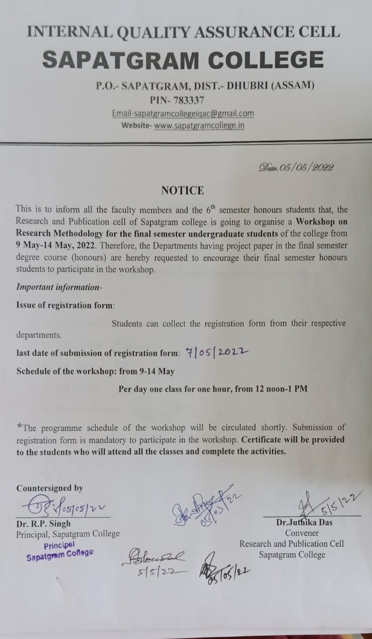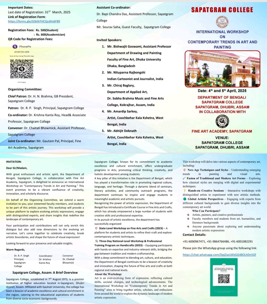 - Notice regarding International Workshop On "Contemporary Trends in Art And Painting" by Department of Bengali, Sapatgram College in collaboration with Fine Art Academy, Sapatgram. View