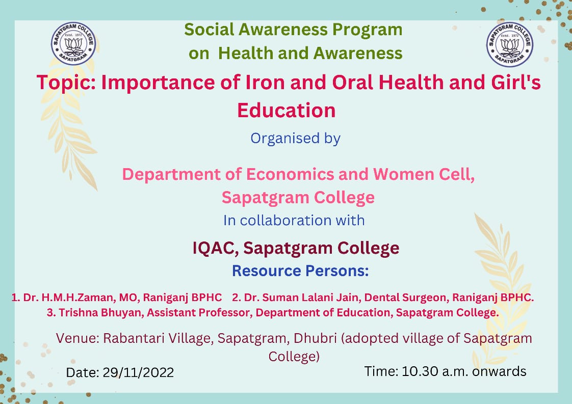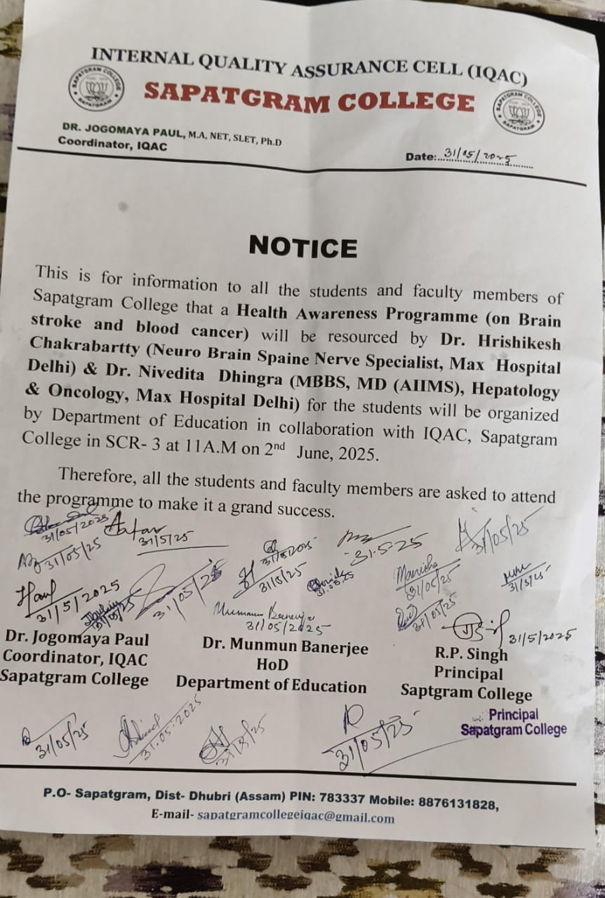 - Notice regarding "Health awareness programme on 'brain stroke and blood cancer" by Department of Education in collaboration with IQAC, Sapatgram College View