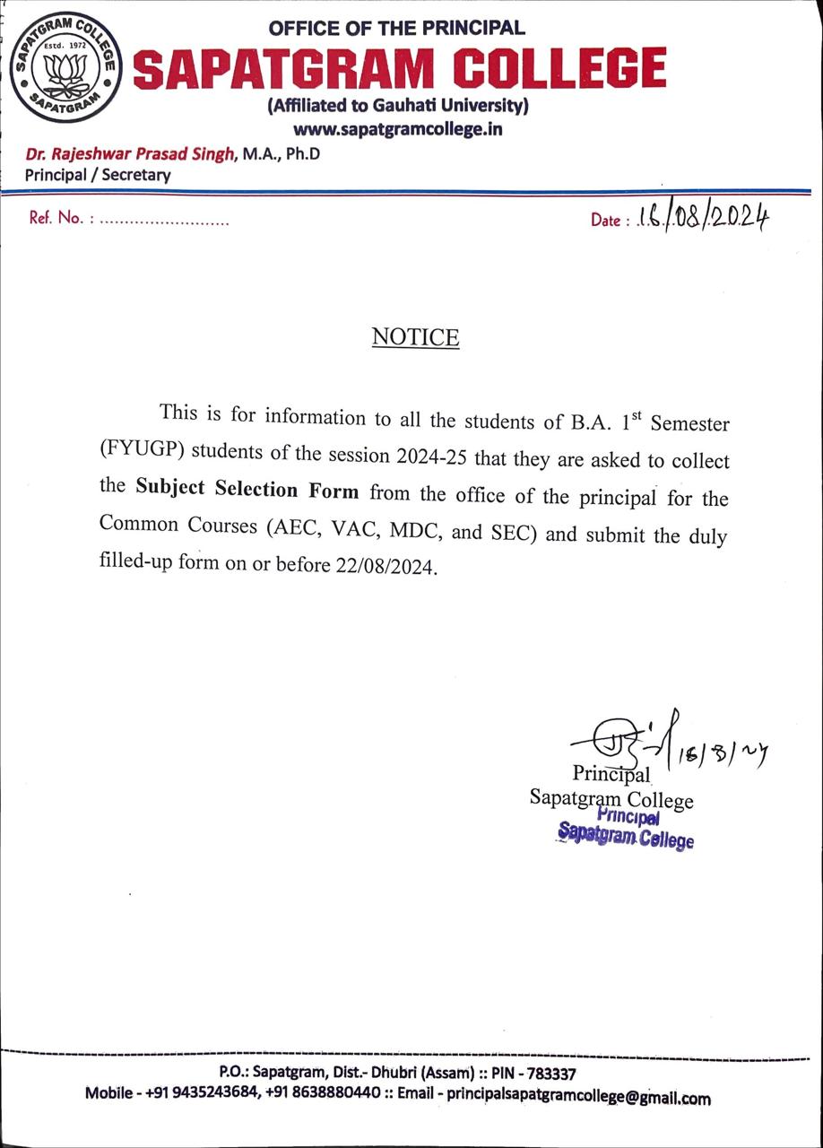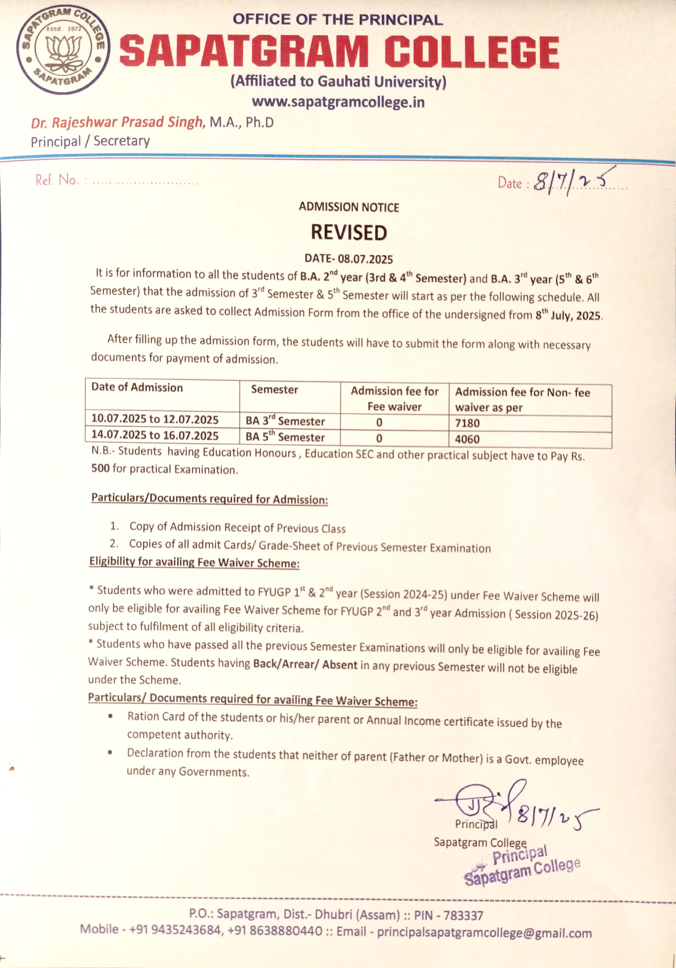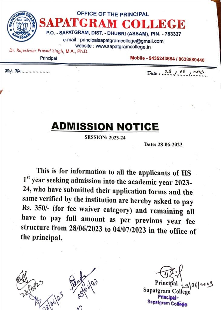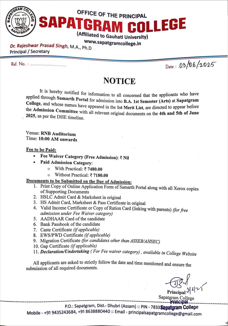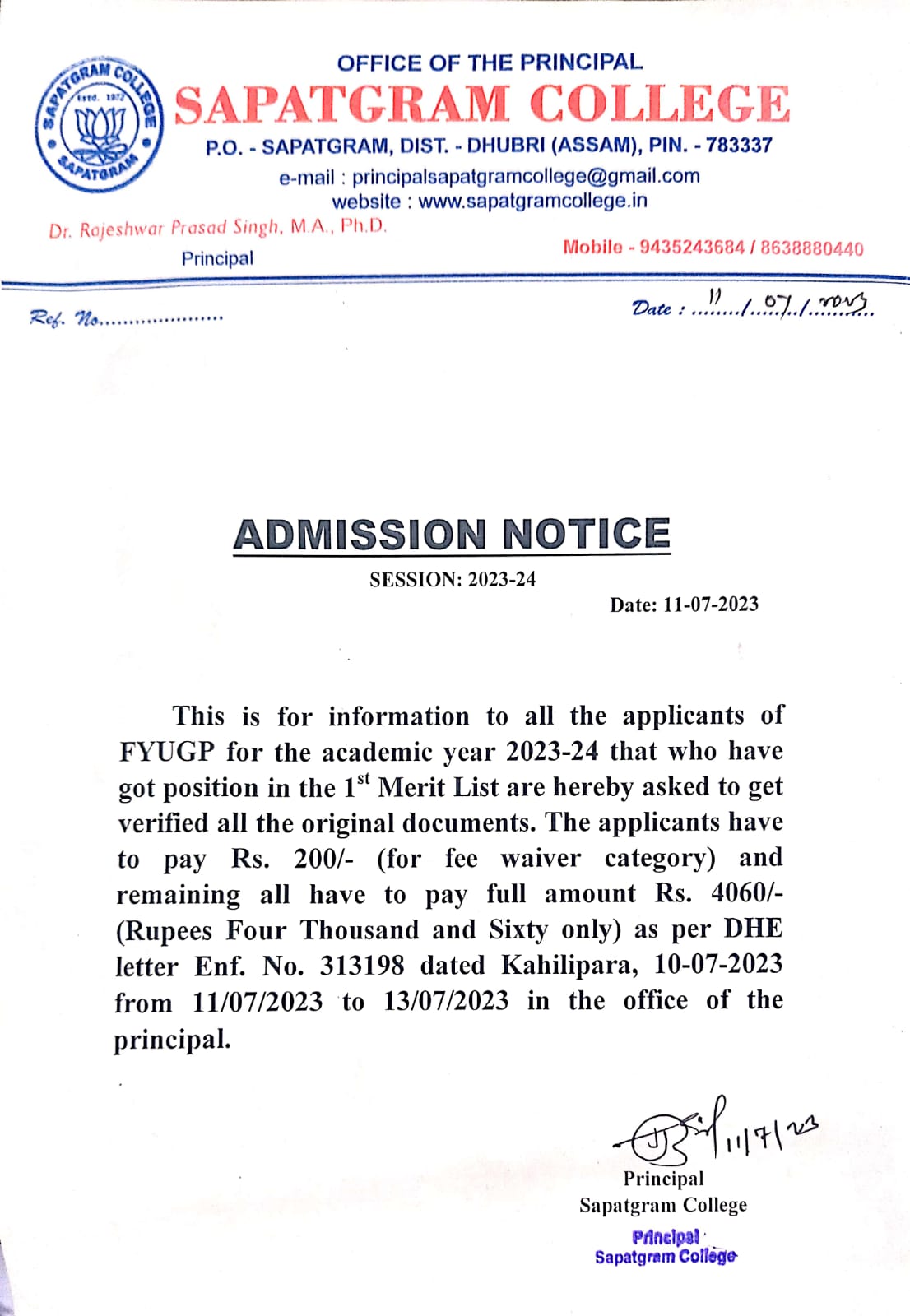 - Notice regarding admission into B.A 1st Semester (Arts) at Sapatgram College View
