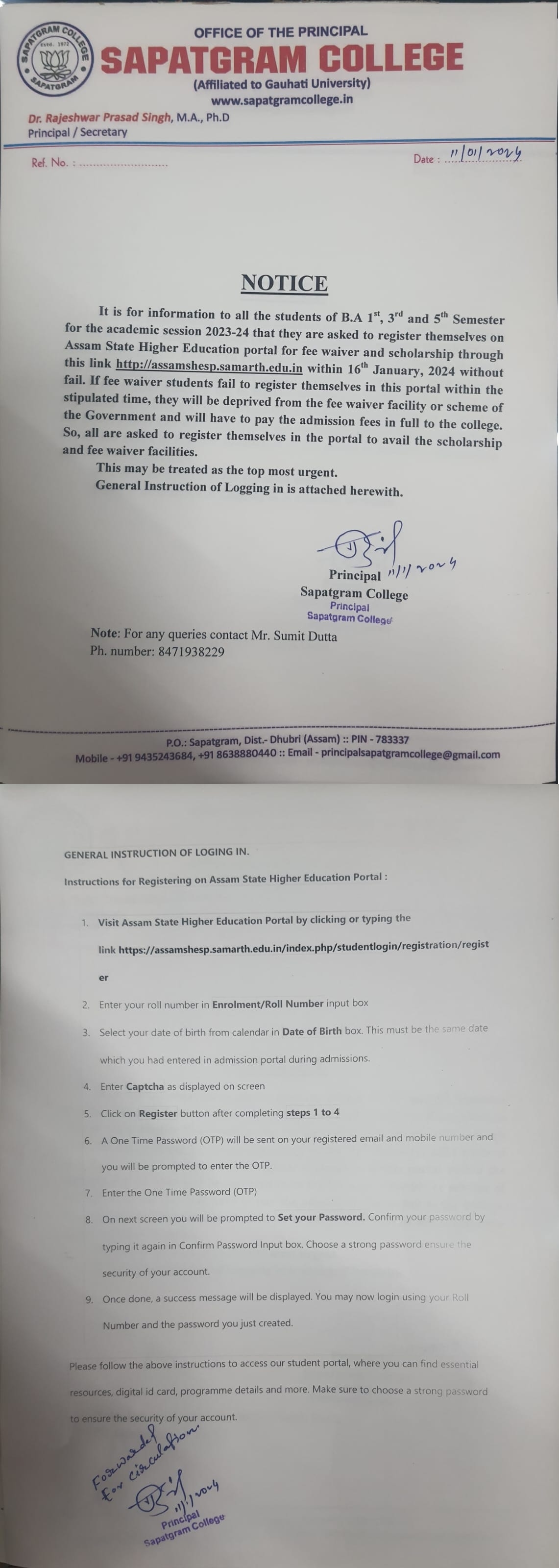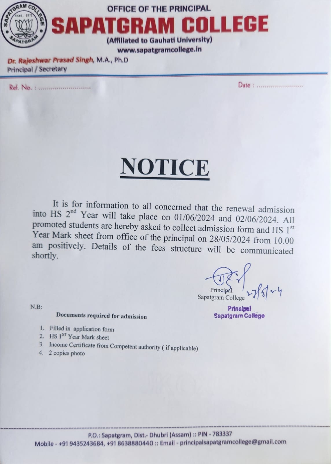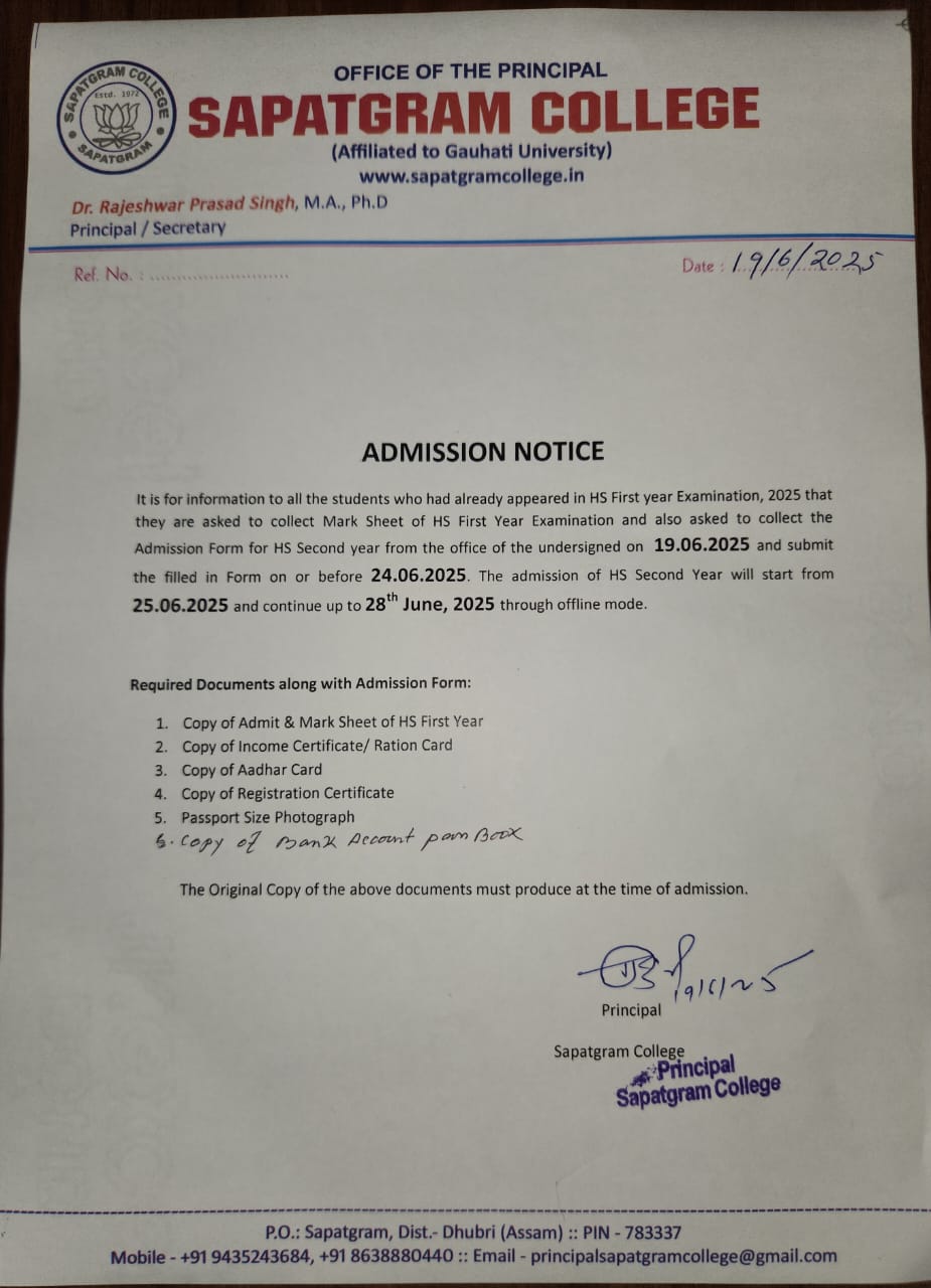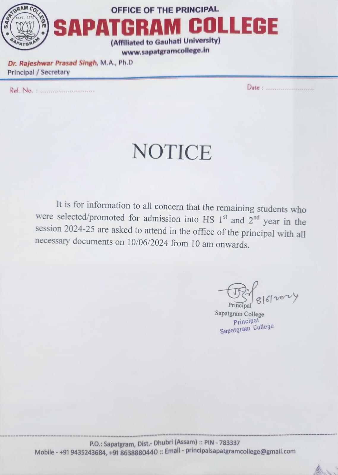 - Notice regarding admission into B.A 1st Semester (Arts) at Sapatgram College View
