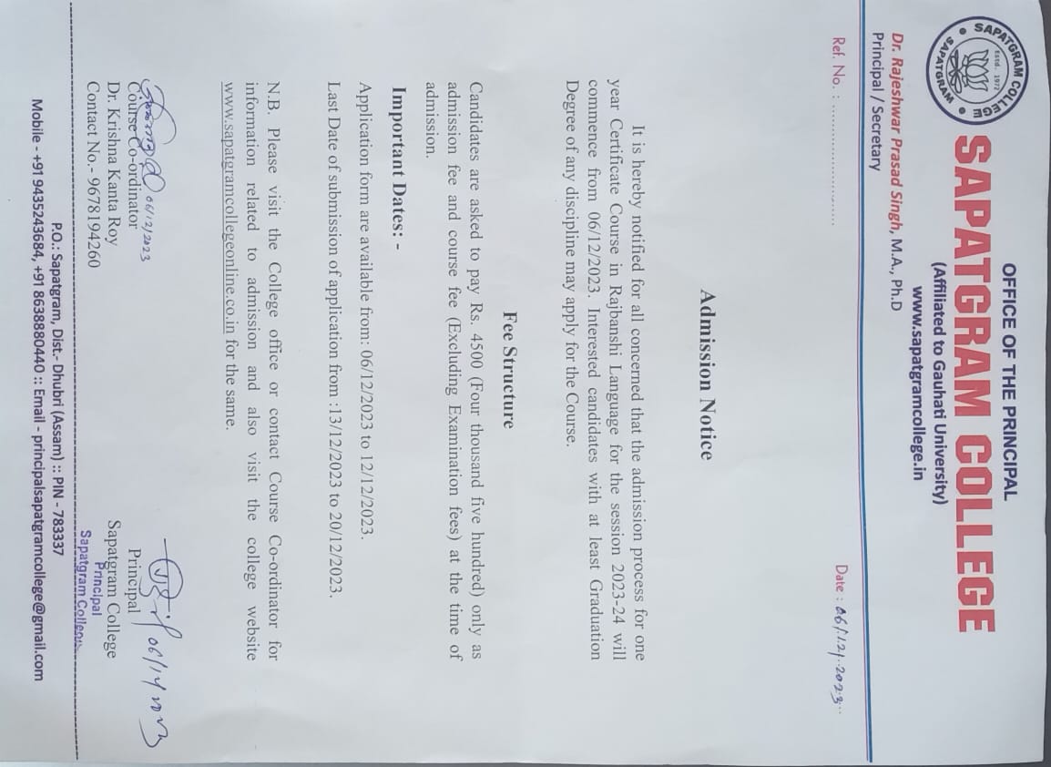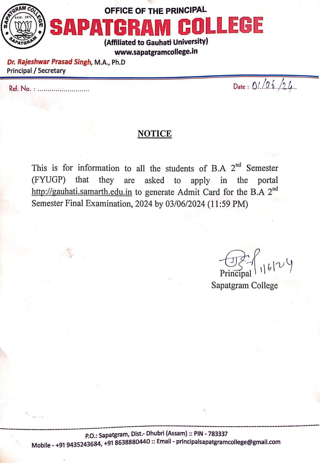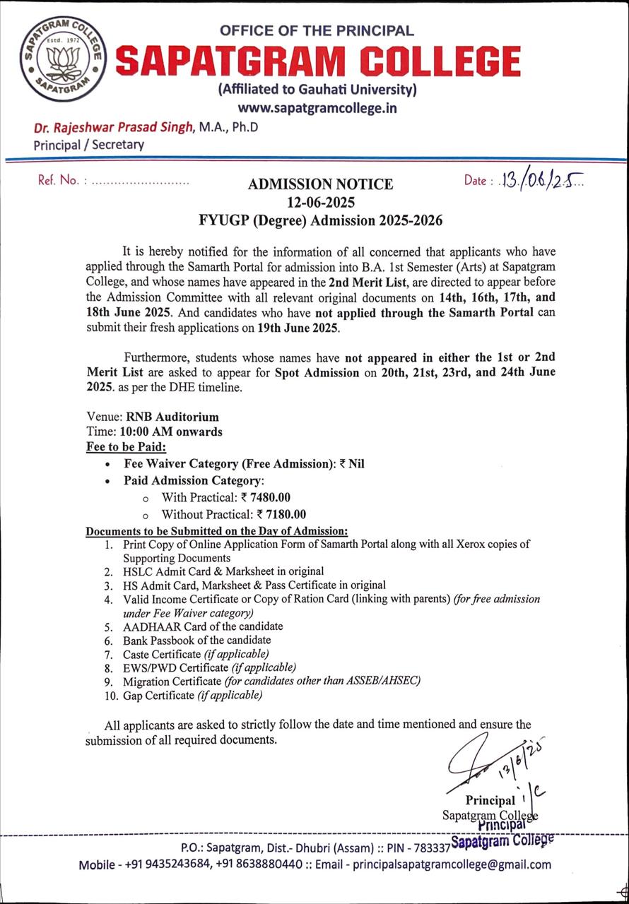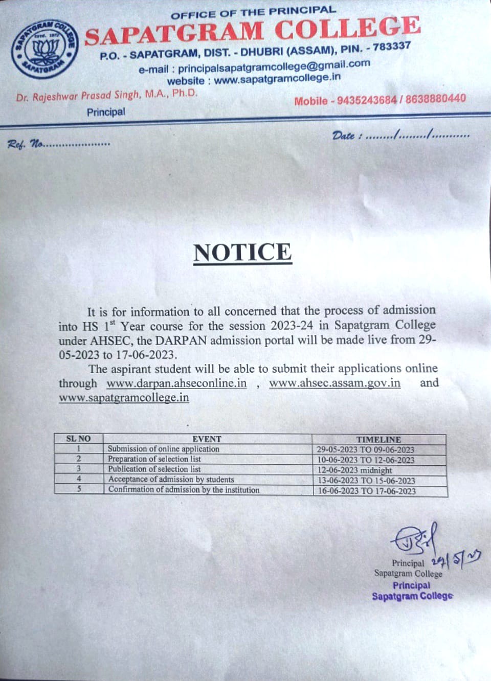 - Notice regarding admission into B.A 1st Semester (Arts) at Sapatgram College View