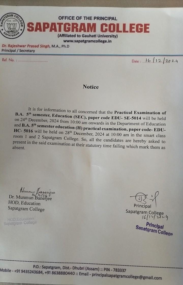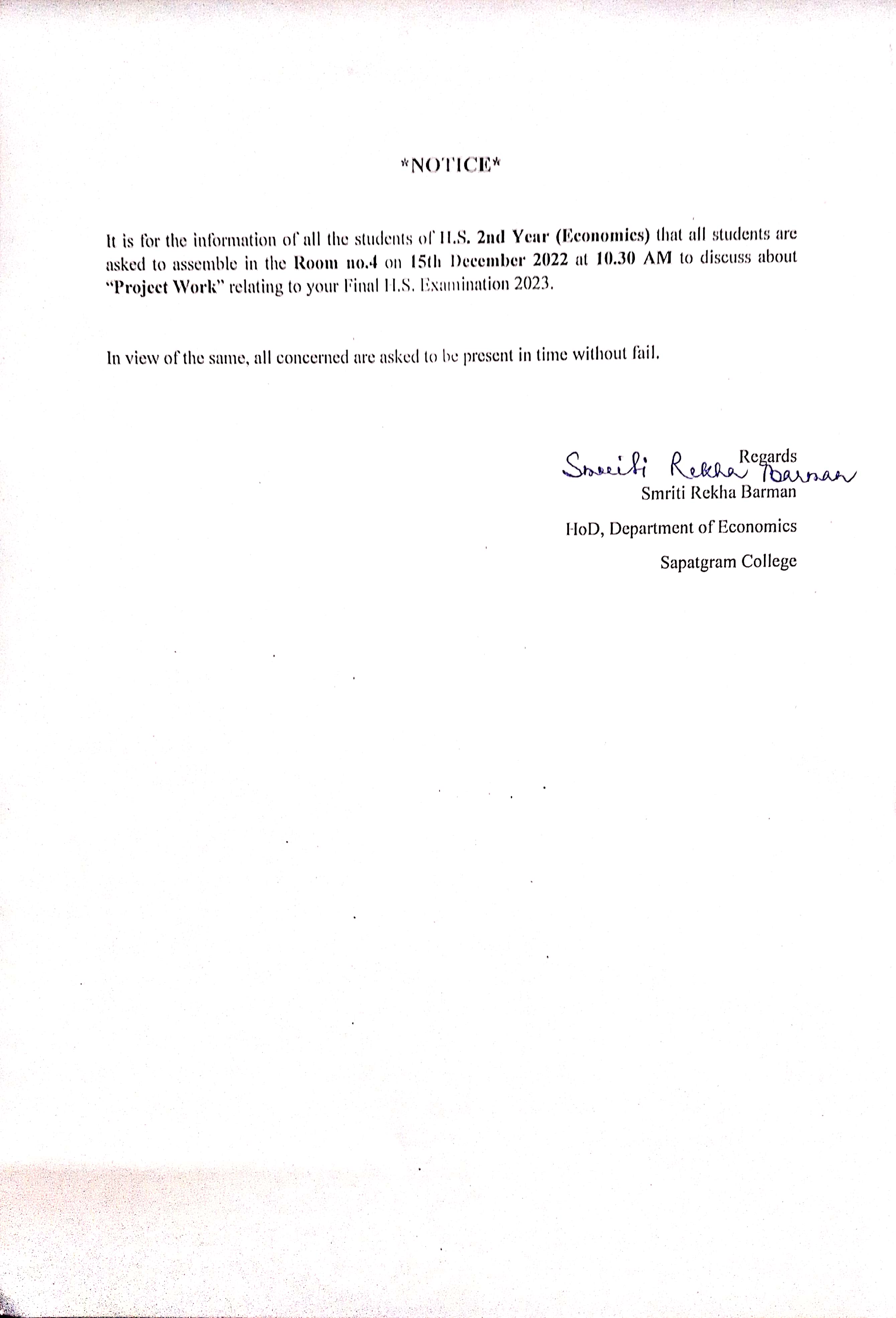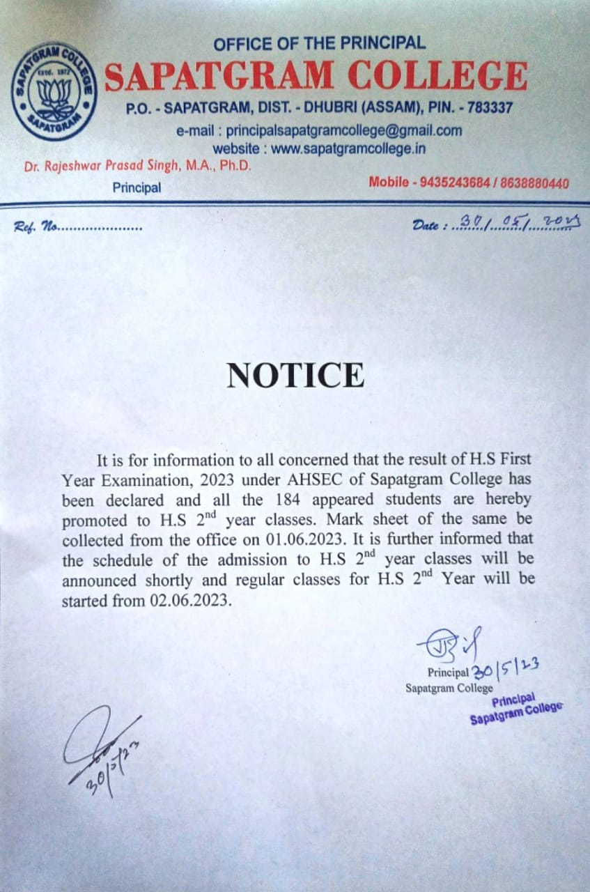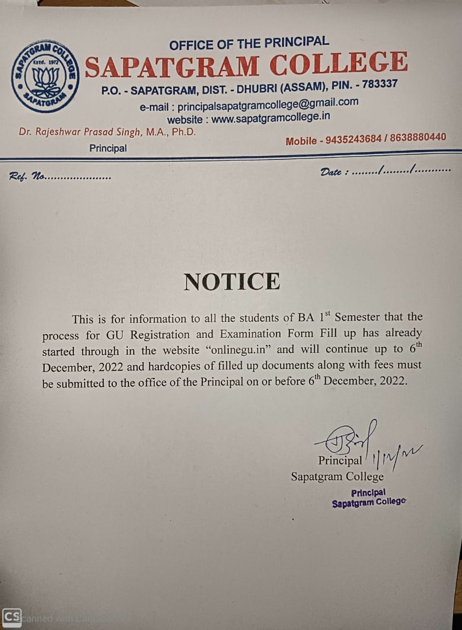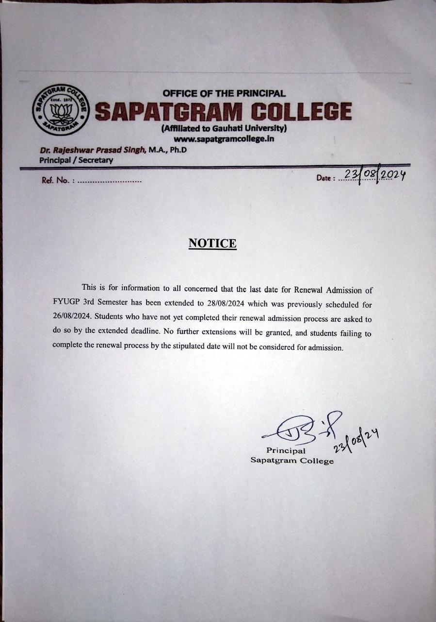 - Notice regarding admission into B.A 1st Semester (Arts) at Sapatgram College View