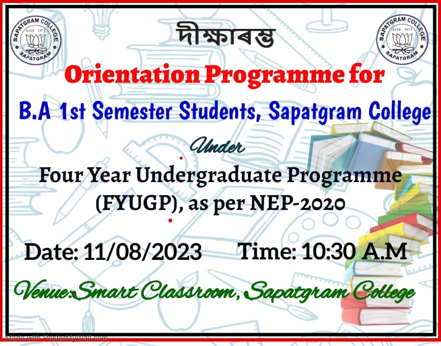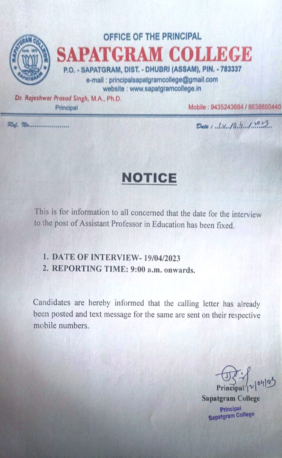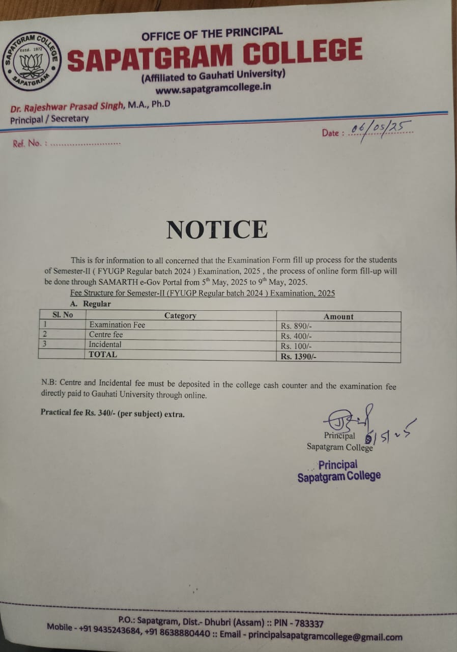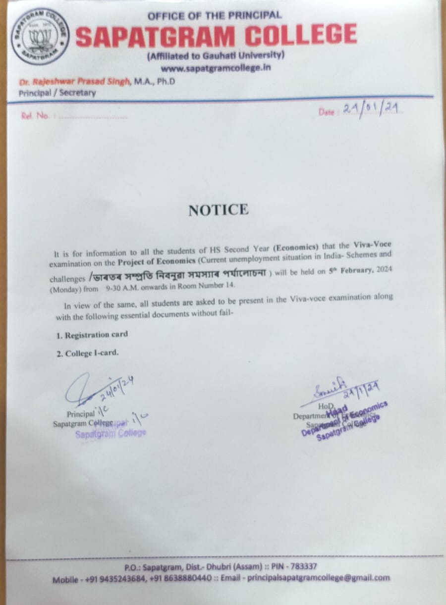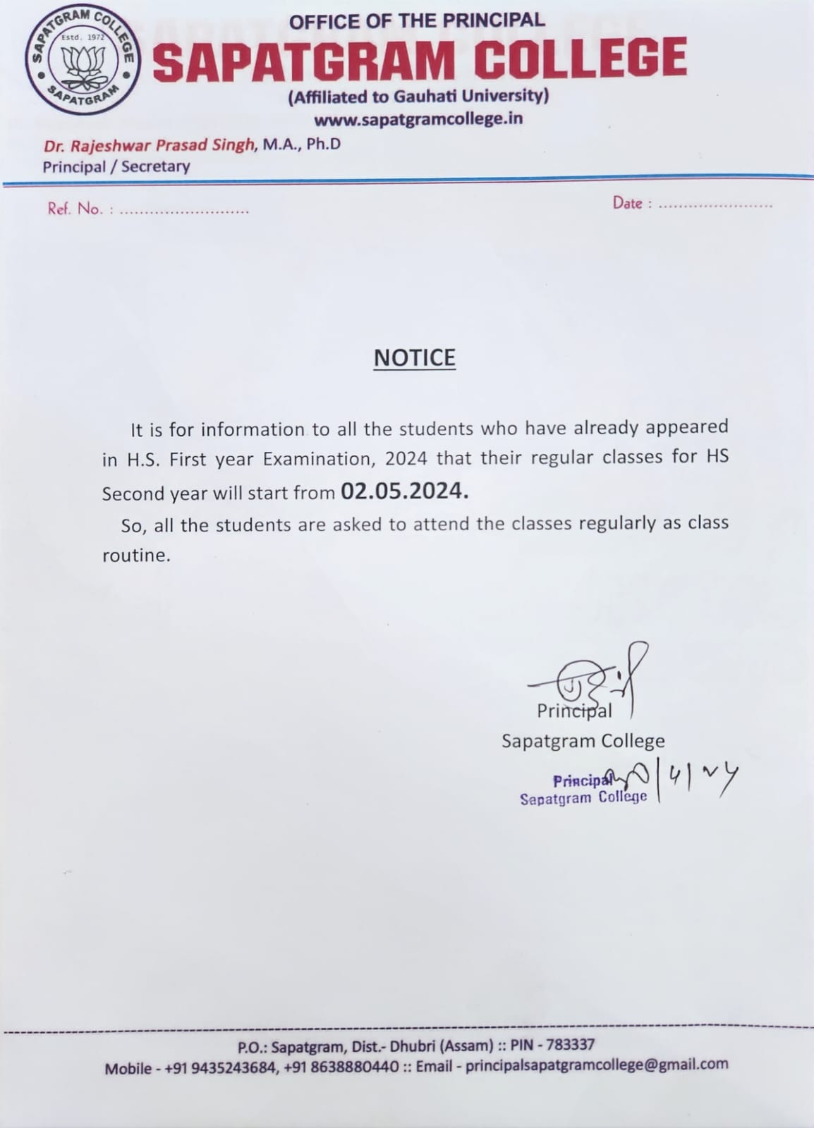 - Notice regarding admission into B.A 1st Semester (Arts) at Sapatgram College View