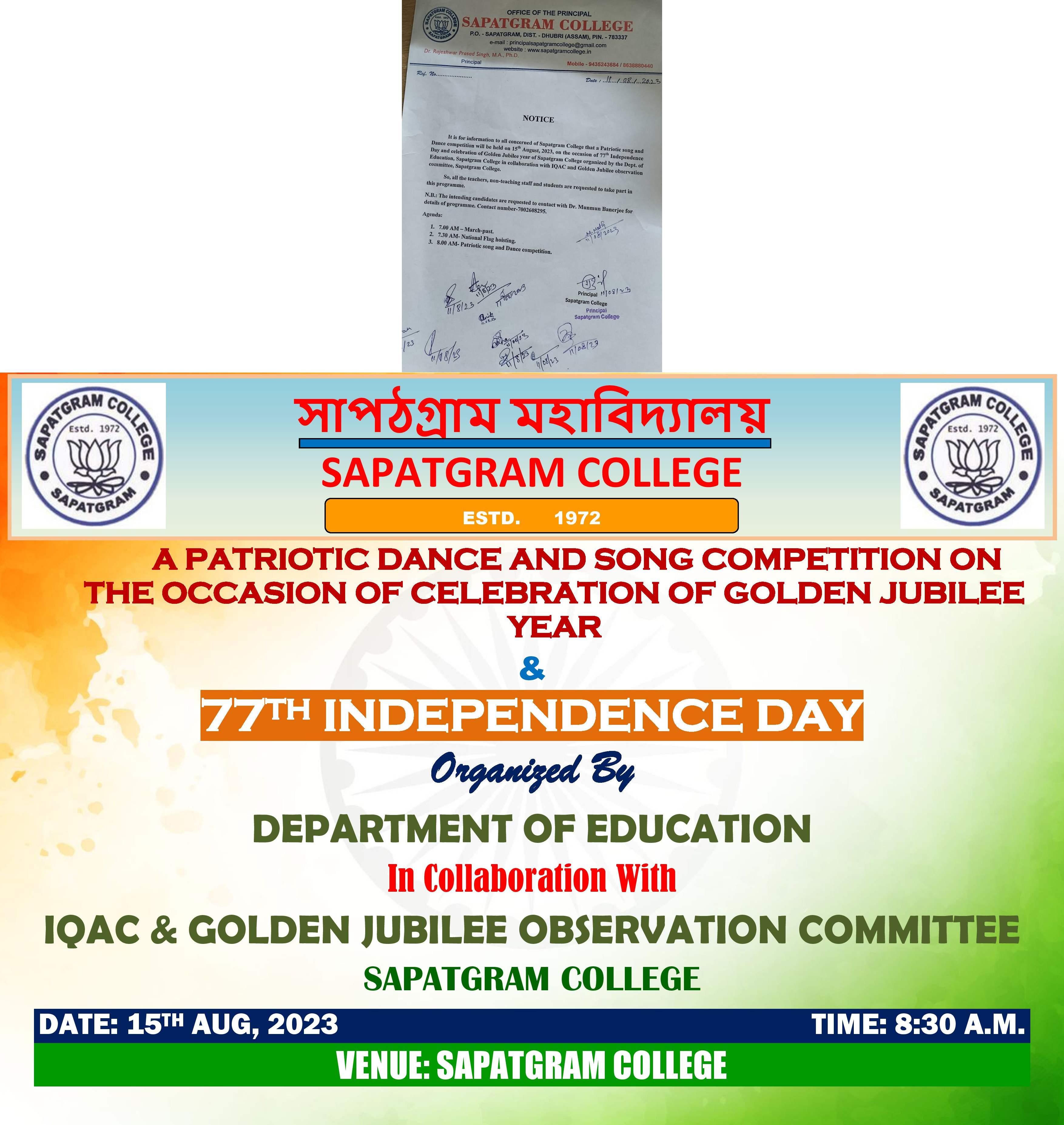 - Notice regarding Celebration of 79th Independence Day by Department of Education in collaboration with Poly Dance Academy, Sapatgram. View