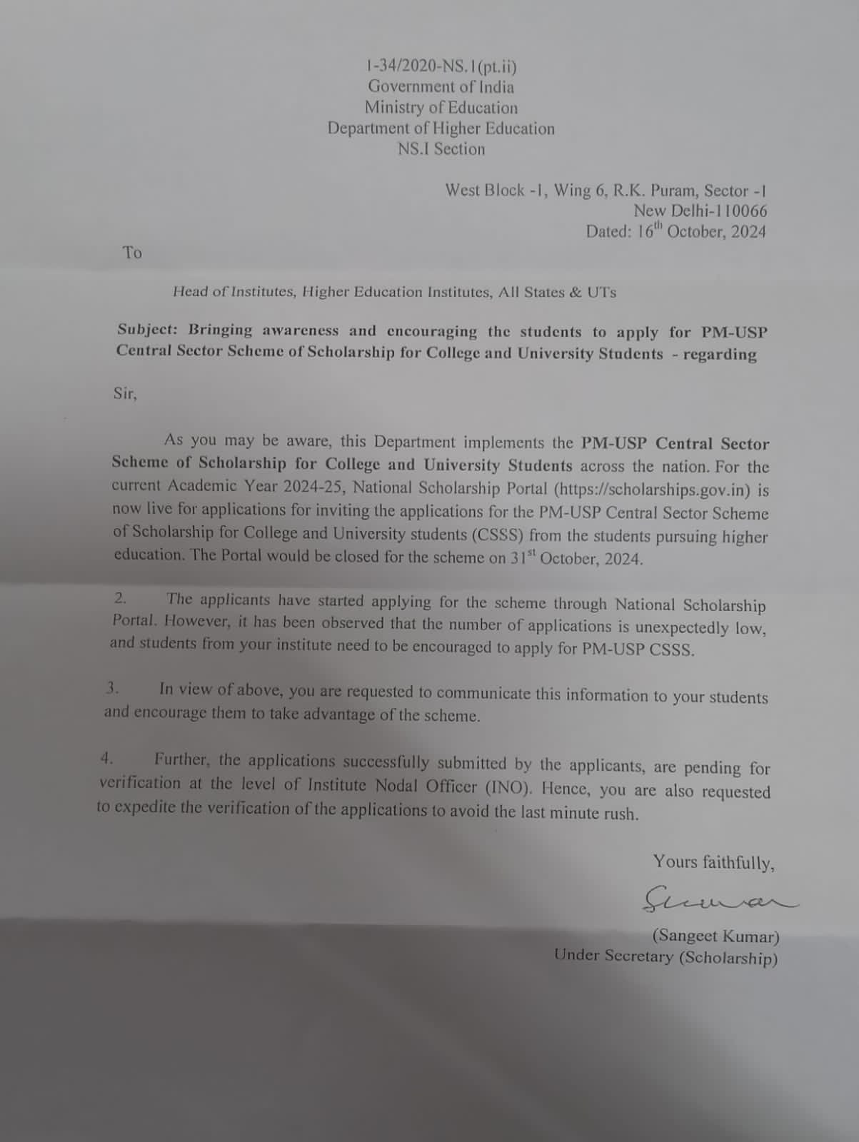 - Notice for students to apply for PM-USP Central Sector Scheme of Scholarship for College and University students for the academic year 2024-25 View